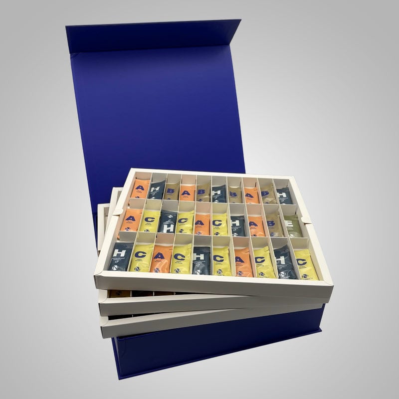 The result is a standardized product box with a total of 3 levels and 30 compartments (top insert = days 1 to 30, middle insert = days 31 to 60, bottom insert = days 61 to 90). Each small daily compartment contains a sachet filled with an individual nutrient complex for easy intake.